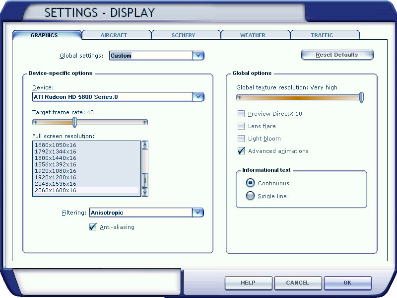 While flying around specific airports or areas, one may further need to fine-tune values of Target Frame Rate, Terrain and Water, Autogen Density, Traffic, etc.