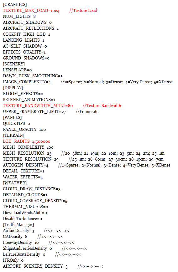 While flying around specific airports or areas, one may further need to fine-tune values of Target Frame Rate, Terrain and Water, Autogen Density, Traffic, etc.