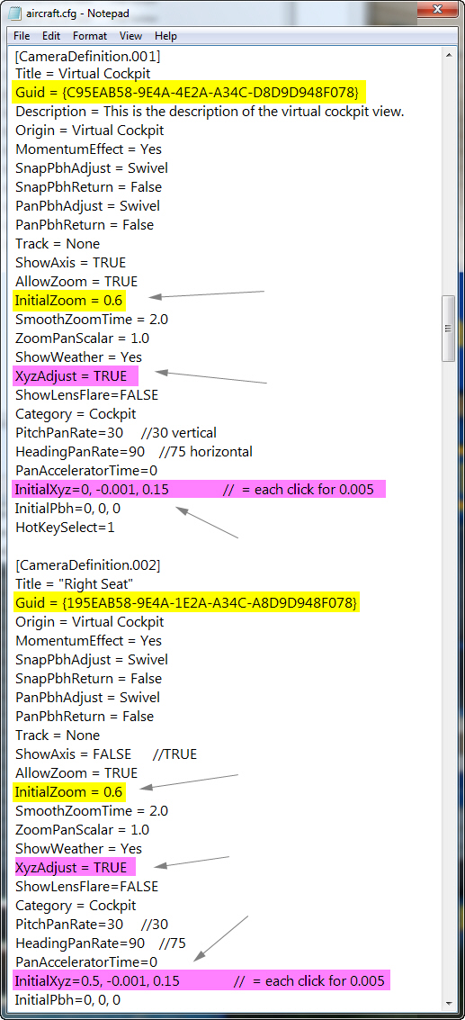 5) Look for the two CameraDefinitions with Title=Virtual Cockpit and Title=Right Seat