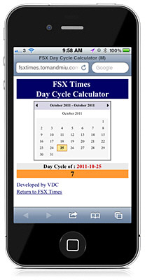 Here’s the mobile versionof the FSX Day Cycle Calculator customized for iPhones and smart phones.
