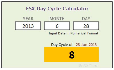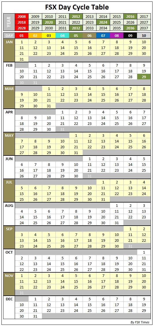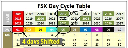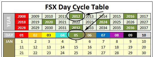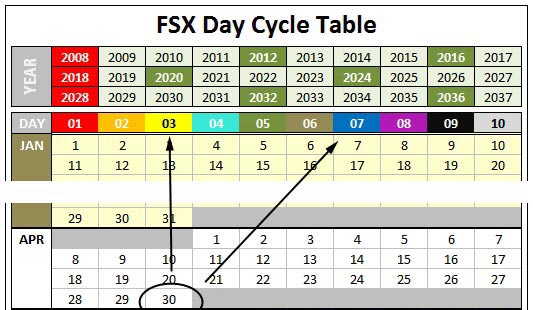 Based on above criteria, I have created an FSX Day Cycle Table, from which the active Day of a specific date could be easily identified.
