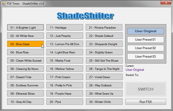 The Shade Shifter has already included 30 Presets from version 1.01 and 1.02 of SHADE for FSX — nearly all Presets from the developer.   In addition, it allows the keeping and using of user’s current Shade settings, plus up to three other customized Presets.