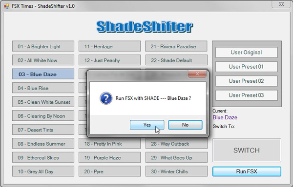 After the desired Preset is selected, just click the [Run FSX] button.    SHADE for FSX with the desired Preset will be loaded, and then followed by the running of FSX.