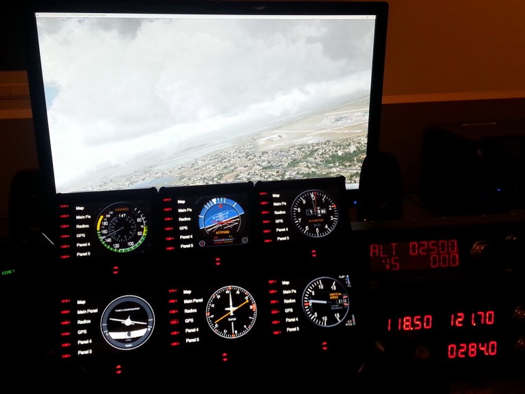I started by purchasing Saitek’s yoke, rudder, multi and radio panels. I then added 3 more gauges, switch and bip panels, then purchased the GPS5.