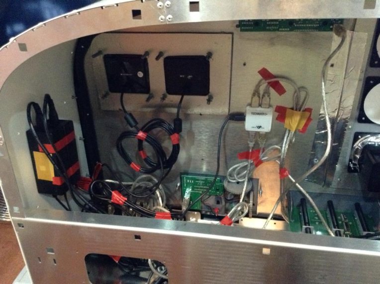 The rig is running on 3 x 42″ TVs on HDMI, which i bought very cheap. Awesome size when you sit before it.