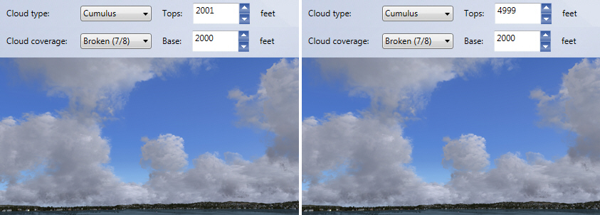 As seen in the image below, when a cloud’s Base Height is set to 2,000 feet, the appearance of it with a Thickness of 1 feet as show in the left image is equal to the result with a Thickness of 2,999 feet as shown in the right image.