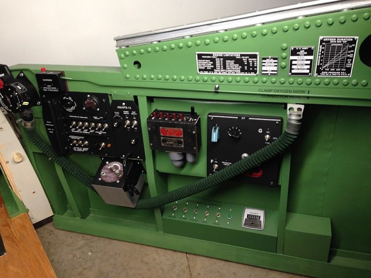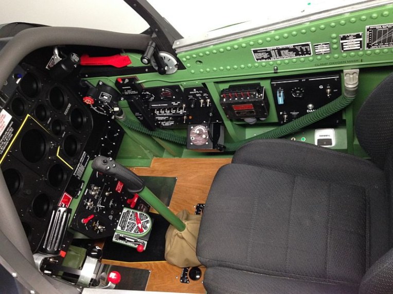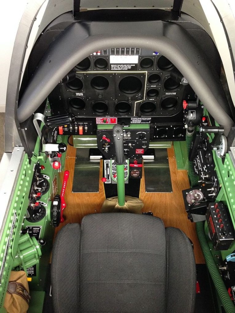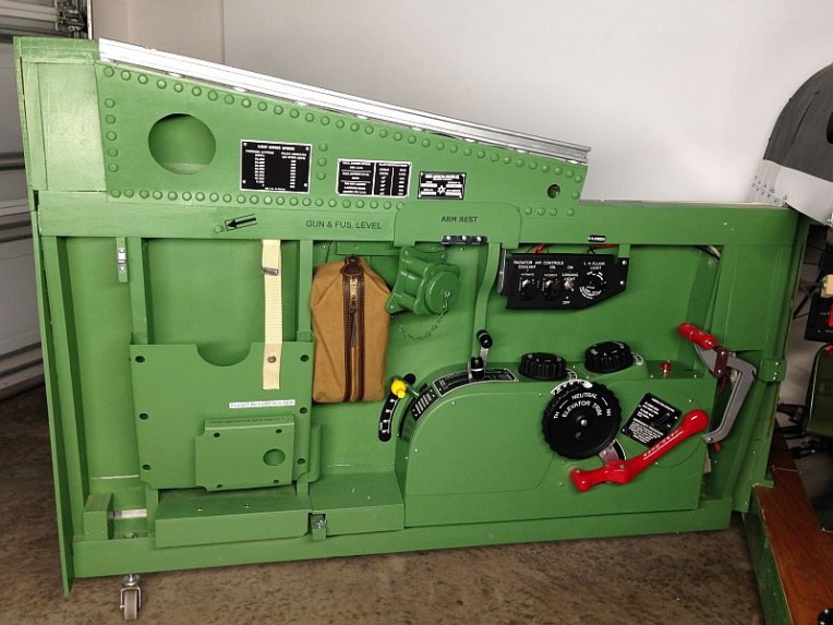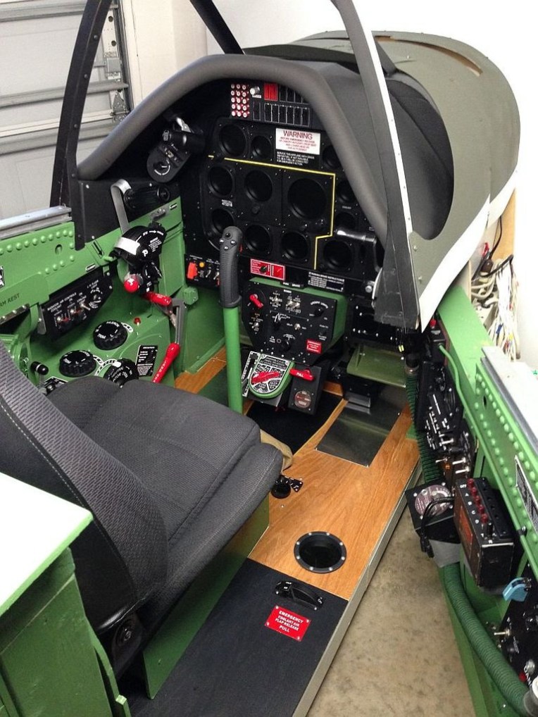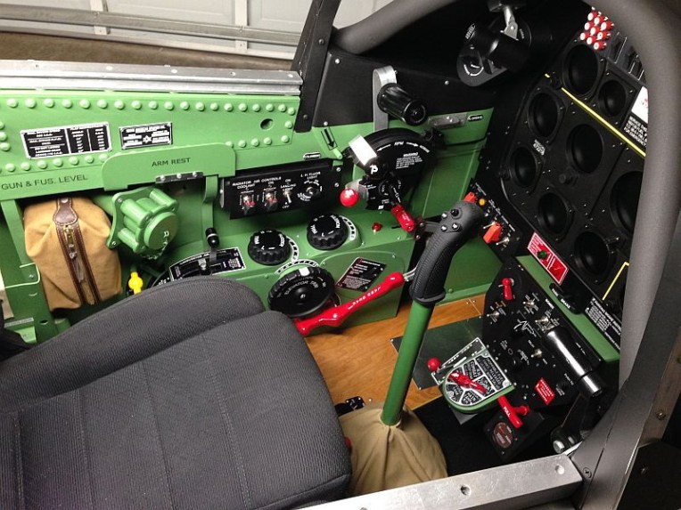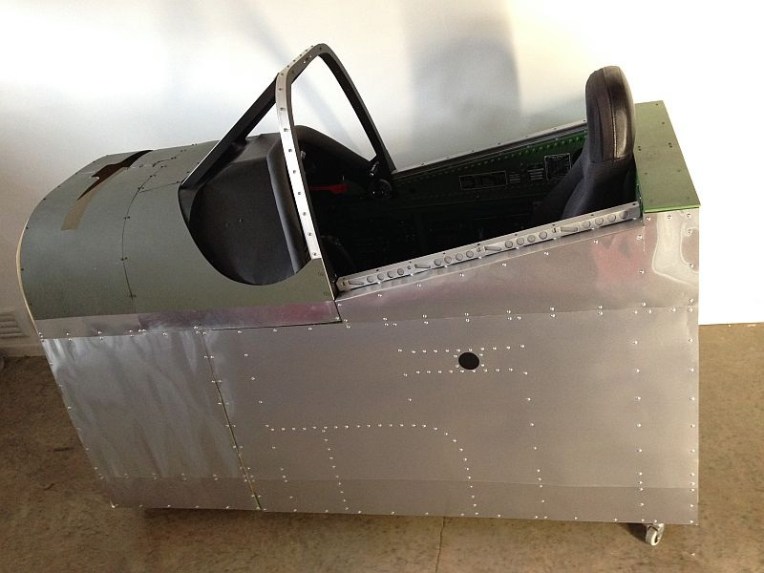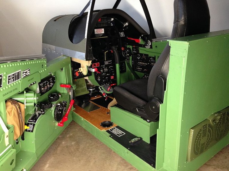 This is a full scale P-51D cockpit that measures 38″ wide by 69″ long by 50″ tall. A 46″ LCD is the main screen viewed using TrackIR. A 27″ LCD is behind a Lexan template with 6 encoders for the main instruments. A 7″ LCD is mounted below the MIP for the oxygen gauges and two more 7″ LCD’s on the floor display the wing fuel tanks.