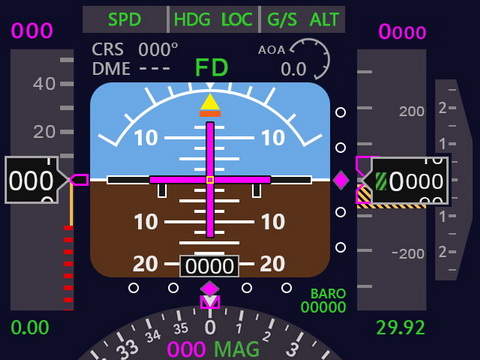 is generally completed with all the features found on the default B737 PFD, such as warning bars and displays for maximum and minimum speeds, decision height and altitude, etc.
