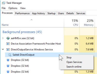 Right-click on the “Saitek DirectOutput” item and select “stop”