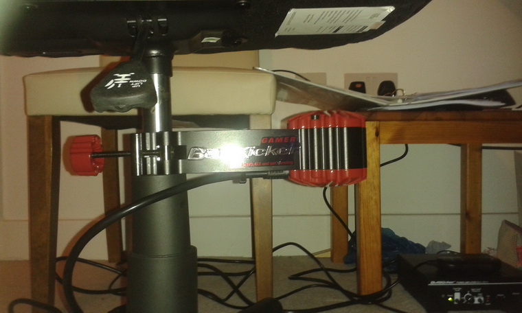The Buttkicker Gamer 2 is a device that takes the bass from your sound output and converts it into vibrations. You can attach the actual Buttkicker to your chair as shown below.