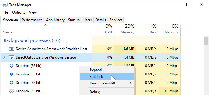Right click Windows taskbar and choose to open “Task Manager”. If “DirectOutputService Windows Service” exists, right click it and end it.