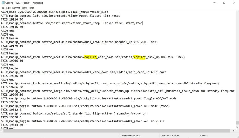 - You will also need to change the “Cessna 172SP/Cessna_172SP_cockpit.obj” and find the line that refers to the “sim/radios/obs2_down” and “sim/radios/obs2_up” commands and change them to “sim/radios/copilot_obs2_down” and “sim/radios/copilot_obs2_up” respectively.