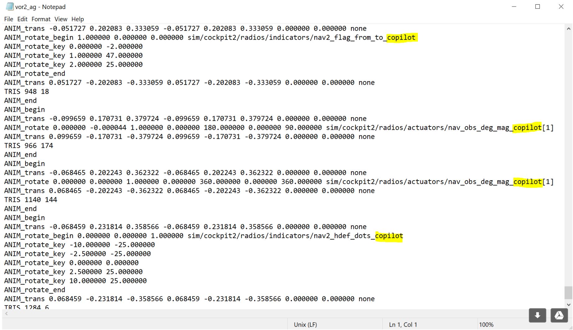 - Edit the “Cessna 172SP/objects/instruments/vor_glideslope_adf/vor2_ag.obj” Find all lines that refer to “_pilot“, and change them to “_copilot” This will wire up the instrument as if the airplane had a full set of copilot instruments and a copilot NAV source selector.