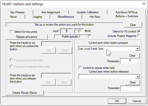 Then under the “Button + Switches” option, assign any button on your joystick or hardware accessories for the function of “List Local Panel Vars”, and click “OK” to save and exit FSUIPC.