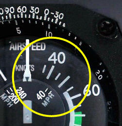 which are wrongly positioned as having higher (faster) values than the airspeed in knots — 40 knots equal to 46.03 mph, rather than 30 something mph as shown on the instrument.
