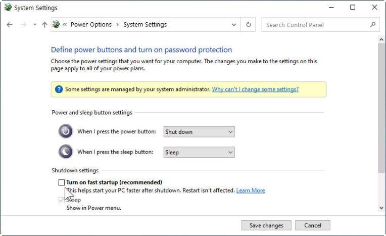 4) Then, uncheck the box of “Turn on fast startup” from the Shutdown settings in the bottom part.