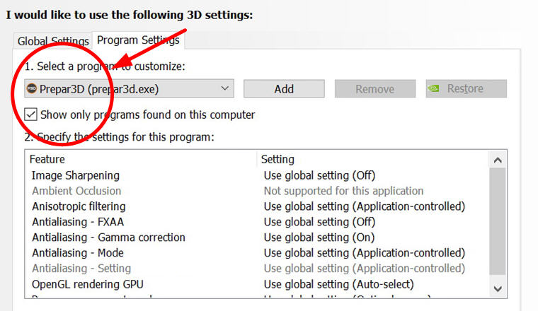 Program Settings in Nvidia Control Panel points to the new P3Dv5, since I still have version 4 on my computer.