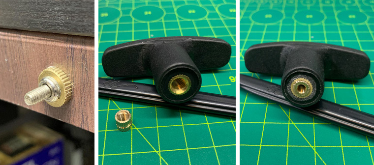 However, as the screw size of it is an M-6 and the shaft of the parking brake is an M-4, I have to additionally source an M-4 brass knurled nut to insert into the hole of it so that the handle could be coupled with the shaft tightly.