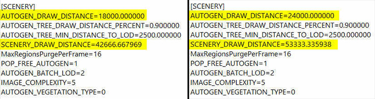 So for testing, I entered 21000.000000 and 50000.335938 in the AUTOGEN_DRAW_DISTANCE and SCENERY_DRAW_DISTANCE instead.