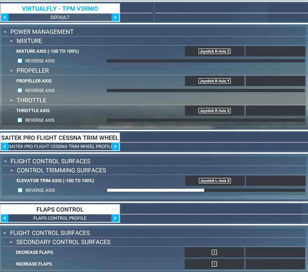 Followings are the button mappings for the VirtualFly V3RNIO TPM, Saitek Pro Flight Cessna Trim wheel and Desktop Aviator Flaps Control. The VirtualFly TPM is recognized by MSFS by default as well.