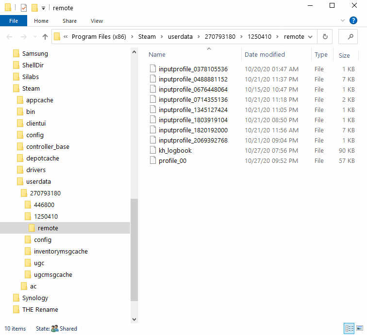 Anyway, here’s the location where user configured control data are stored on my computer — “C:\Program Files (x86)\Steam\userdata\270793180\1250410\remote“.