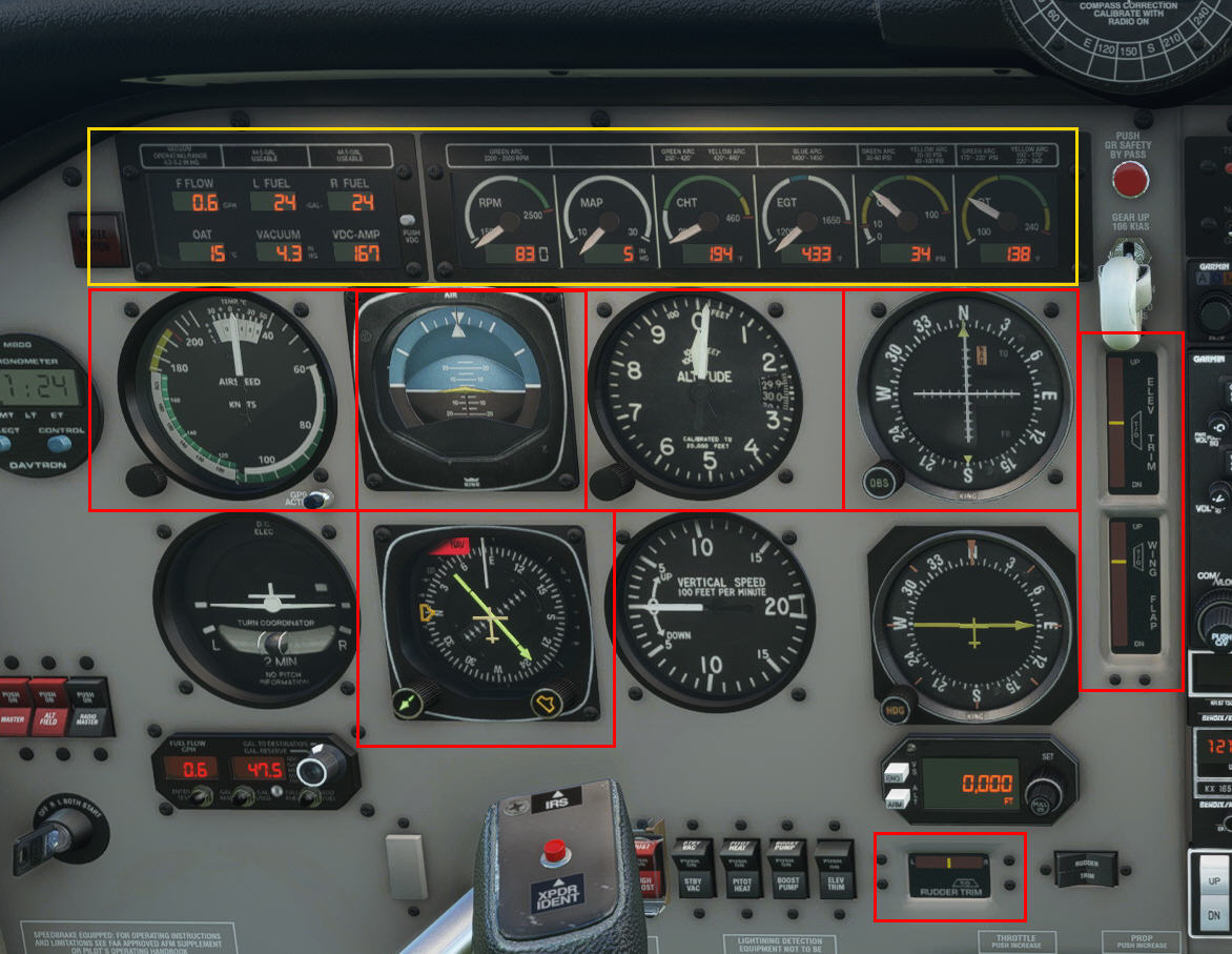On the aircraft, the ADF, TCR and VSI are generally the same MSFS Multi-shared gauges already developed.  The others – ASI, ATT, ALT, HSI, VOR2 and Engine Gauges, plus the LED-style moving Flaps, Elevator and Rudder Trims Indicators – are aircraft specific and so have to be created accordingly.