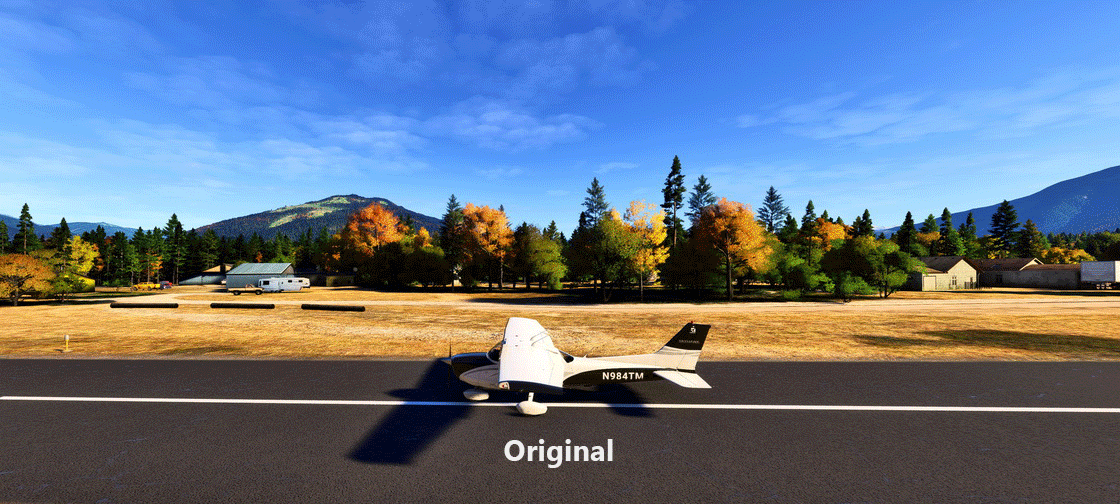 One of the most criticized issues with MSFS2020 is that the trees are oversized and don’t look realistic. There are many different solutions out there. For example, I’ve been using the “Short Height” Vegetation setting in REX AccuSeason Advanced Edition to deal with the issue. It does help a little, but the results are still not ideal.